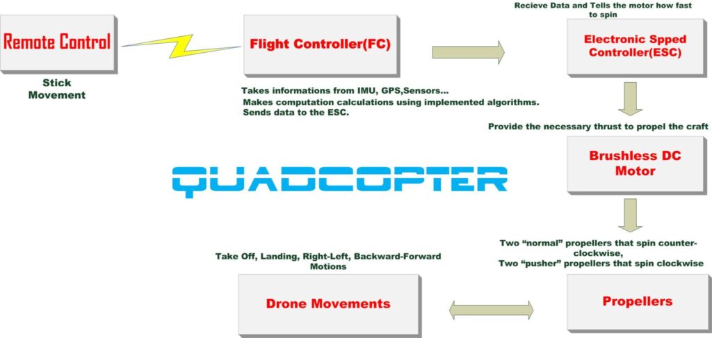 When you first start out, push the sticks, Transmitter sends signals to Flight controller, the FC sends orders after processing to the Electronic Speed Controllers (ESCs) of each motor, the ESC directs its motor to increase or decrease speed, which in turn provide the necessary thrust to its propeller(see below diagram).